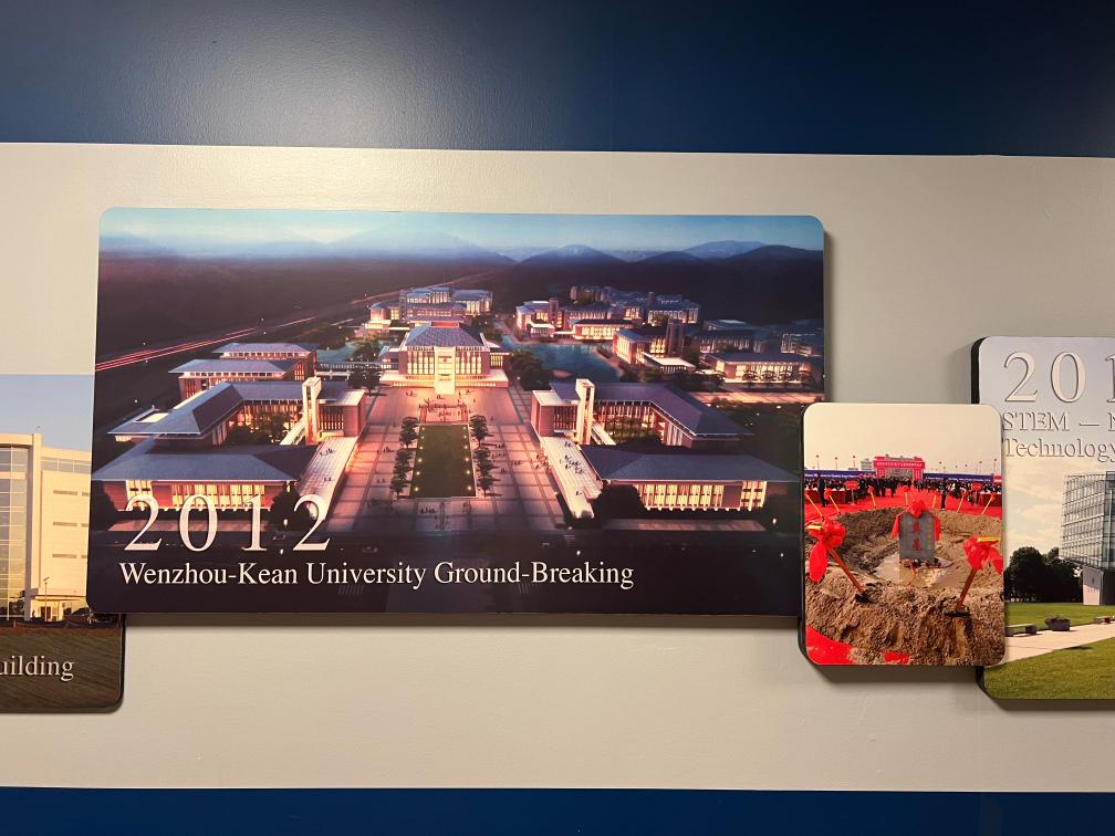 在美国肯恩大学主校区学生中心走廊内悬挂的温州肯恩大学奠基仪式的照片。