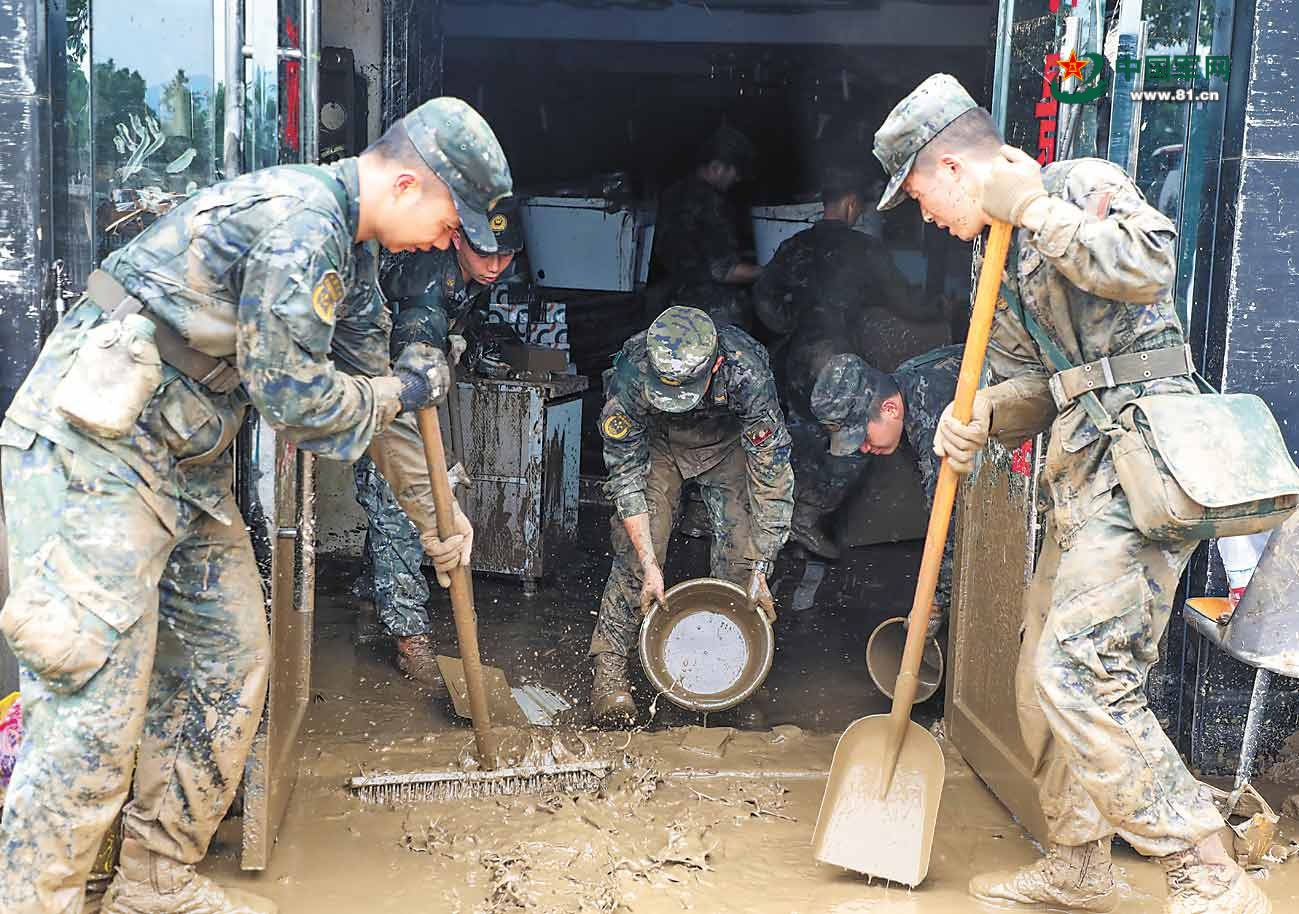 6月21日,武警安徽总队黄山支队官兵在歙县开展清淤工作。曹 浏摄
