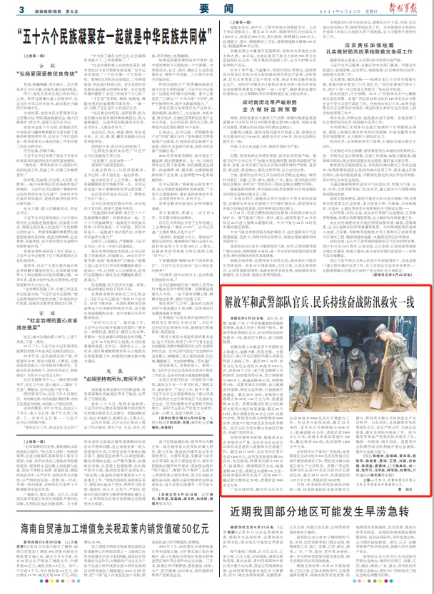 解放军报北京6月22日电 连日来,安徽、福建、广东、广西多地遭遇持续强降雨侵袭,造成人员伤亡和财产损失。解放军和武警部队官兵、民兵持续奋战防汛救灾一线,救助受灾群众、奋力排除险情。