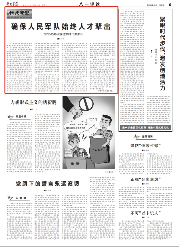 习主席在中央军委政治工作会议上,深刻阐明政治建军时代要求,特别强调要确保人民军队始终人才辈出。这充分体现了习主席对世界军事人才竞争形势的准确判断,对人才强则事业强、人才兴则军队兴规律的深刻把握。我们要全面把握新时代人才强军战略,以更加积极、更有活力、更加有效的人才政策,打造规模宏大、结构合理、素质优良的革命化、专业化军事人才方阵。