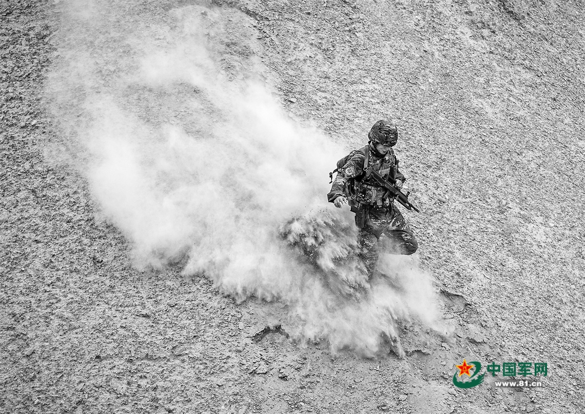 近日,武警兵团总队执勤第三支队组织官兵在大漠戈壁展开追击训练。图为下士李芳兵从一处土坡急冲而下。
