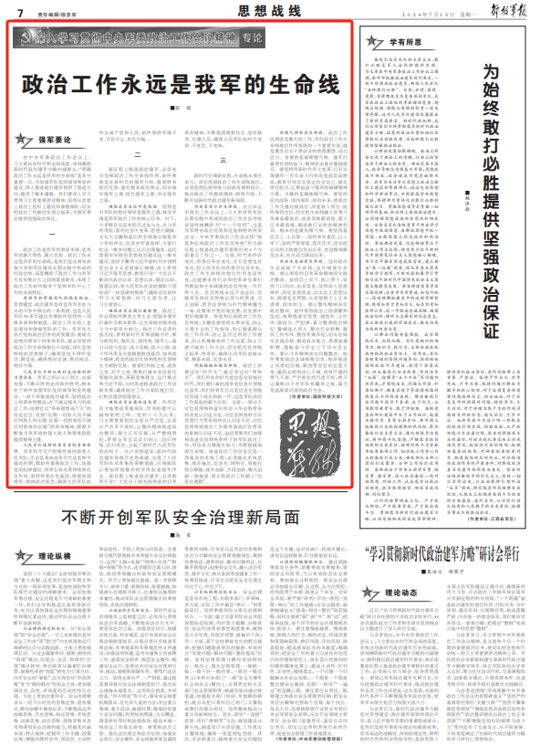 新征程上推进政治建军,必须充分发挥政治工作生命线作用,始终聚焦党在新时代的强军目标,强固特有政治优势,强化根本政治保证,切实铸牢强军之魂、扭住强军之要、夯实强军之基。