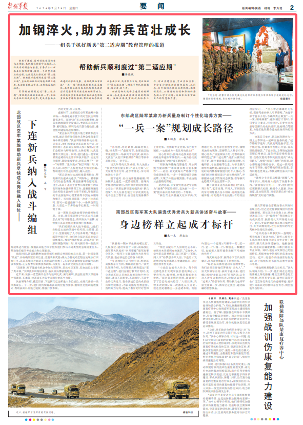 引导新兵顺利度过“第二适应期”,帮助新兵迈好军旅第一步,不仅关乎他们的成长进步,更关乎基层全面建设的长远发展。东部战区陆军某旅“一兵一案”精准规划新兵成长路径、南部战区海军某大队发挥先进典型示范感召作用激发新兵强军动力、北部战区空军某旅将新兵放在急难险重任务中摔打磨砺,帮助新兵尽快适应基层生活、找准努力方向,有效缩短了“第二适应期”,增强了部队的凝聚力、向心力、战斗力。