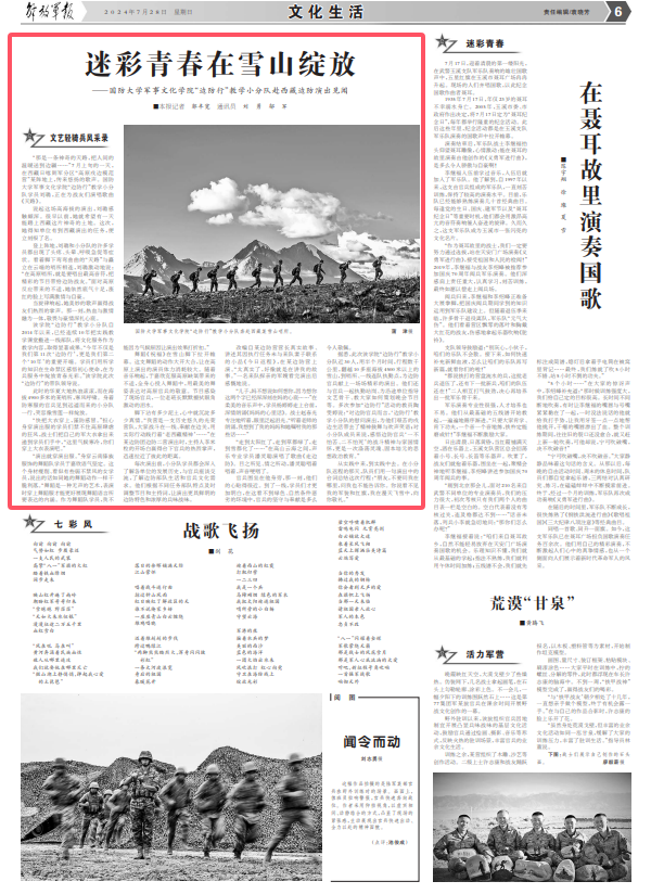 该学院“边防行”教学小分队自2014年以来,已经连续10年把实践教学课堂搬进一线部队,将文化服务作为教学内容,取得显著成果。“今年不仅是我们第11次‘边防行’,更是我们第二个‘10年’的重要开端。学员们用所学的知识在生命禁区感悟初心使命,在为兵服务中绽放青春光彩。”该学院此次“边防行”的带队领导说。