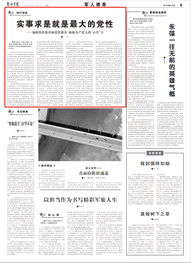 在前不久召开的中央军委政治工作会议上,习主席强调恢复和弘扬政治工作优良传统,要求“坚持实事求是,坚持身教胜于言教,各级特别是高级干部要以身作则、率先垂范,以过硬作风和形象感召带动部队”。实事求是既是我们党的思想路线,也是我军政治工作的优良传统,更是共产党人党性的集中体现。军队党员干部要把实事求是作为最大的党性来追求和坚守,坚持说老实话、办老实事、做老实人,想问题、作决策、办事情始终从部队实际出发,以抓铁有痕、踏石留印、久久为功的务实作风推动各项工作落实落细,不断创造实实在在的业绩。