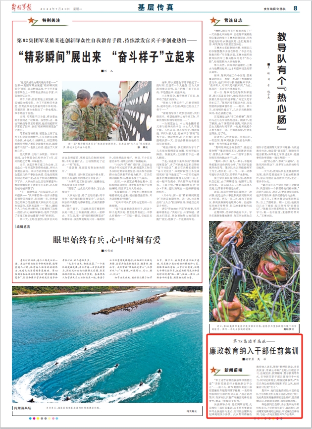 “军士选晋有哪些敏感事项需要注意”“表彰奖励怎样才能做到公平公正”……前不久,第78集团军某旅干部任前廉政专题集训落下帷幕,一名即将到新岗位任职的指导员说:“通过此次集训,我深刻认识到严守廉洁纪律的重要性,提高了拒腐防变能力。”