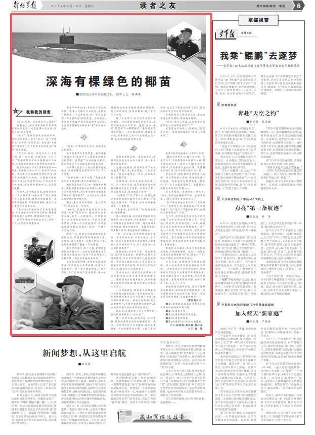 蔡泽平今年23岁,年纪尚不及我的兵龄。我第一次操作方向舵时,也像他一样紧张。不过我坚信,他一定可以像我一样直面风浪,挺进深蓝。这份自信,来自我当兵26年潜行深海的岁月沉淀,来自我常服胸前8枚略章“犁”出的奋斗航迹。