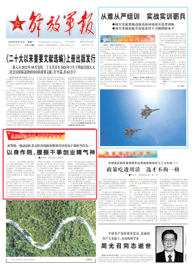 “习主席在中央军委政治工作会议上指出,坚持实事求是,坚持身教胜于言教。党员干部的一言一行、一举一动,有着重要的示范引领作用,只有以身作则带好头,率先垂范往前冲,才能真正当好标杆。”该支队领导介绍,他们前期调研发现,少数党员干部存在理论学习不够扎实、工作标准不够高等问题。对此,在深化政治整训中,他们认真组织官兵深入学习贯彻中央军委政治工作会议精神,探索推出党员干部“带头学、带头悟、带头讲、带头做”举措,引导大家发挥带头示范作用、主动担当作为,营造一级做给一级看、一级带着一级干的良好氛围。
