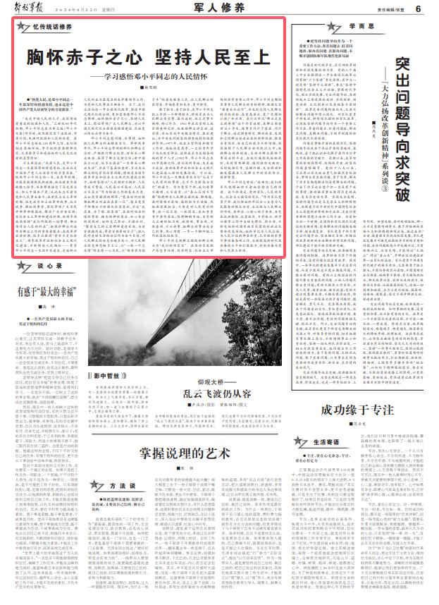 邓小平同志曾说:“我确信,我们的军队能够始终不渝地坚持自己的性质。这个性质是,党的军队,人民的军队,社会主义国家的军队。”作为军队党员干部,我们要始终牢记全心全意为人民服务的根本宗旨,永远做与人民群众同呼吸、共命运、心连心的子弟兵,自觉在抗洪抢险、抗震救灾、乡村振兴、助学兴教等工作中当好先锋队、排头兵,不断发扬和巩固军政军民团结的政治优势和优良传统;始终牢记为人民扛枪、为人民打仗的神圣职责,扎实做好军事斗争准备各项工作,全面提高新时代练兵备战水平和打赢能力,时刻准备为党和人民再立新功。