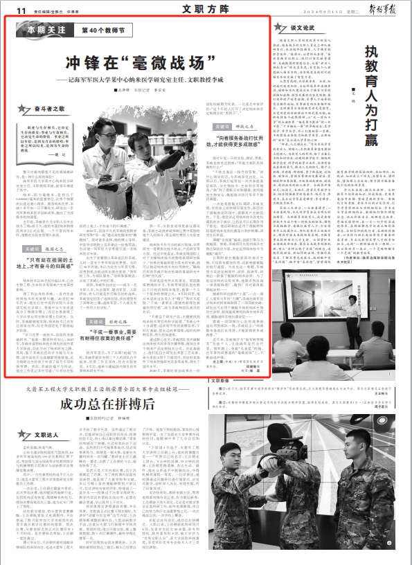 纳米,即为毫微米,是相当于0.000001毫米的度量单位,比单个细菌的长度还要小得多。置身纳米世界,李威十多年如一日不懈攻关,研发出一系列军事纳米医学创新成果,跑出了为战服务的加速度。