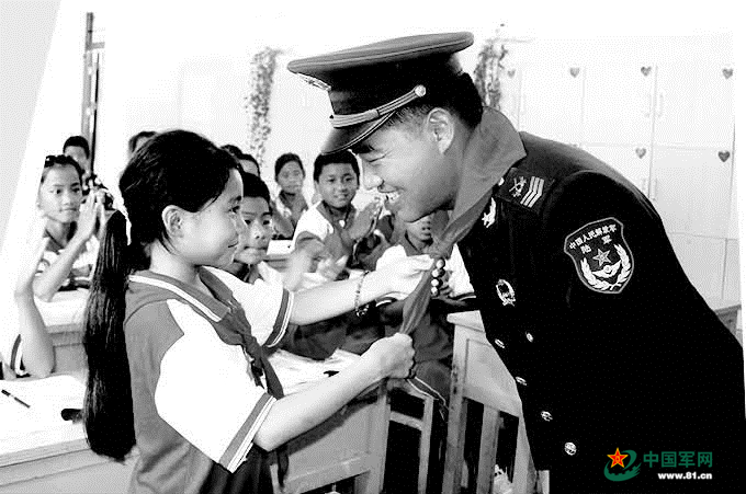 学生为“兵老师”周国仁佩戴红领巾。 马 军摄