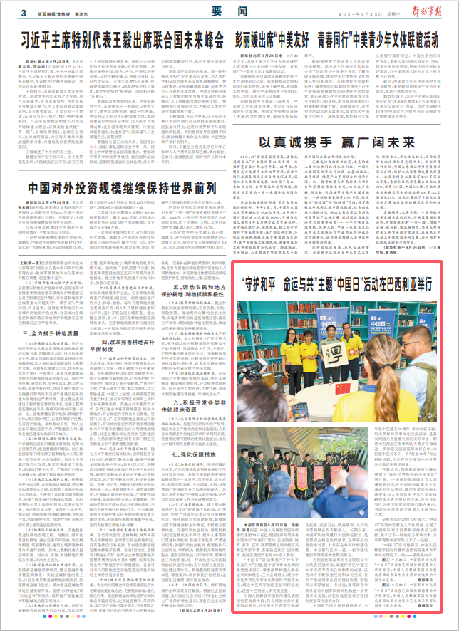 解放军报巴西利亚9月23日电 琚振华、张淼报道:中国人民解放军国际传播代表团23日在巴西国防部高等防务学院举行“中国日”活动,巴国防部、陆军、海军、空军、联邦警察总局高级官员和巴专家学者、多国驻巴武官、国际媒体、我驻巴使馆代表共300余人参加。