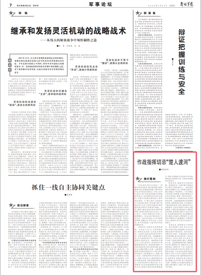 《吕氏春秋·察今》中讲述了一则楚宋战争的故事:楚军谋划渡过澭河偷袭宋国,特意提前测量了澭河深浅并在沿岸划定位置标记,不料之后河水突然大涨,夜间渡河的楚军未能察觉到变化,依然按照原来的标记渡河,大量兵马惊慌失措而落水,最终损失惨重。从“楚人渡河”这则故事中不难发现,楚军行动失败与墨守成规有很大关系,导致其未能及时察觉澭河涨水情况并采取相应措施。当前,随着大量先进技术被应用到军事领域,战争形态和作战方式发生了巨大变化。信息化智能化的“洪流”正澎湃激荡,一些过去的“渡河标记”已然失效。面向未来战争,只有突破思想束缚,准确识变、科学应变、主动求变,善于因变制敌,才能夺取未来战场制胜先机。