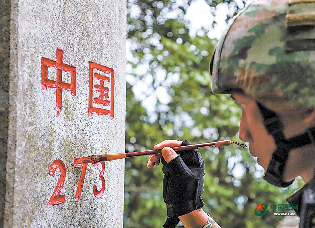 下午3时多,巡逻分队经过长时间的艰难跋涉,终于到达最后一个点位。擦拭界碑、描红、检查边境设施……最后,官兵们站在界碑前展开五星红旗进行宣誓,铿锵誓言响彻边关。