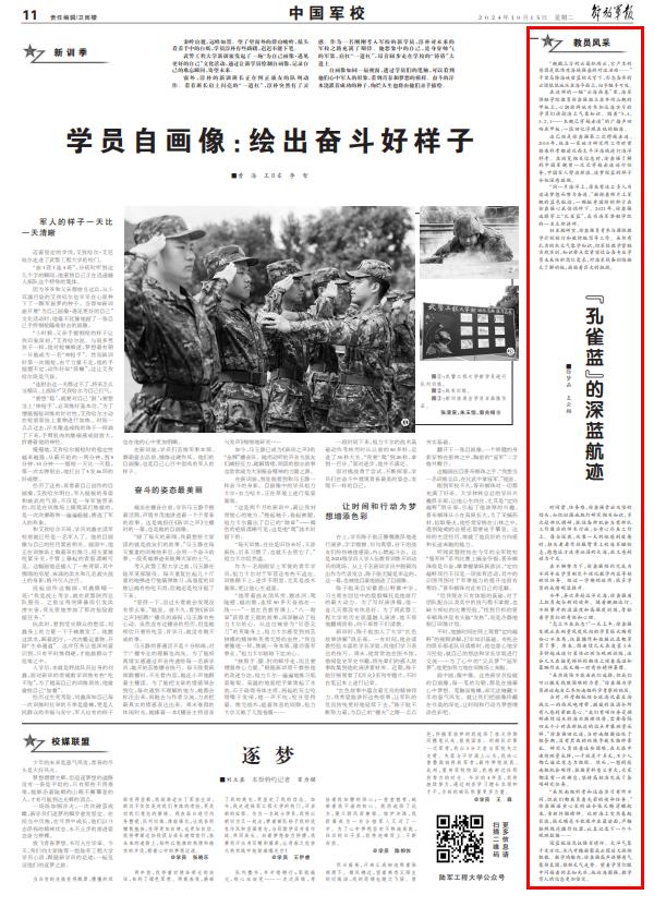 “同一片海洋上,原来有这么多人为追逐梦想而努力奋进。”凝视着照片上军舰的蓝色航迹,一颗献身国防的种子在徐鑫强心底悄悄种下。2021年,徐鑫强选择穿上“孔雀蓝”,成为海军潜艇学院的一名文职讲师。