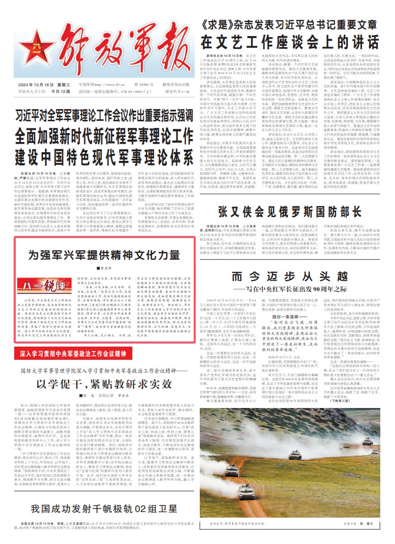 军人之魂,文以铸之。当前,我军正处于转型建设的关键期,必然会遇到不少新情况新问题,尤其要清醒地看到,各种思想文化交流交融交锋更加频繁、意识形态领域斗争尖锐复杂,更加需要发挥文艺的力量,凝聚官兵思想、砥砺官兵斗志、鼓舞官兵士气。新征程上,军队文艺工作者要深入学习实践习近平文化思想,推出更多反映时代呼声、展现官兵风采、振奋战斗精神、陶冶高尚情操的优秀作品,努力为官兵精神补钙、士气加钢、思想淬火,为实现中国梦强军梦提供强大精神文化力量。