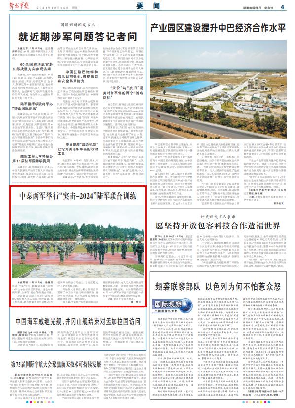 解放军报昆明10月15日电 徐健昆报道:中泰“突击-2024”陆军联合训练15日上午在云南昆明开始。这是中泰两军第7次举行“突击”系列联合训练。