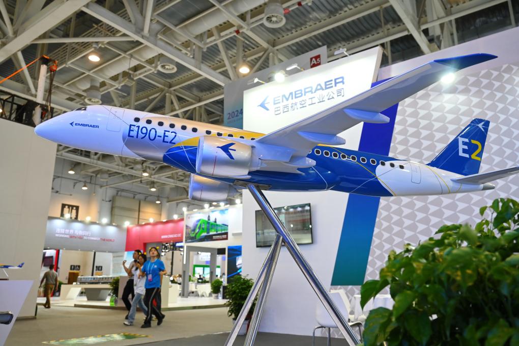 这是在厦门举行的2024金砖国家新工业革命展巴西展位展出的E190-E2飞机模型。新华社记者林善传摄