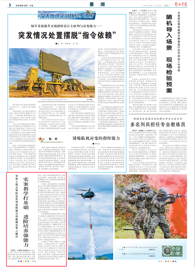“实践中,我们紧贴部队任务需要抓教育人,扭住课程创新建设深化教学改革,通过实案教学、进阶培养,逐步形成训教融合育人模式。”该院领导介绍,此前,他们多次到部队调研,听取一线指挥员、基层官兵和毕业学员反馈,结合多方意见建议调整优化学科体系,区分不同模块重组原有教学内容,调整多个与部队需求贴得不紧的课题方向;跟进部队演训实践,围绕相关专业收集训练数据、演训案例,更新充实教学内容;聘请经验丰富的部队指挥员、专家骨干担任客座教授,定期来院进行专题授课,不断打牢学员任职基础。
