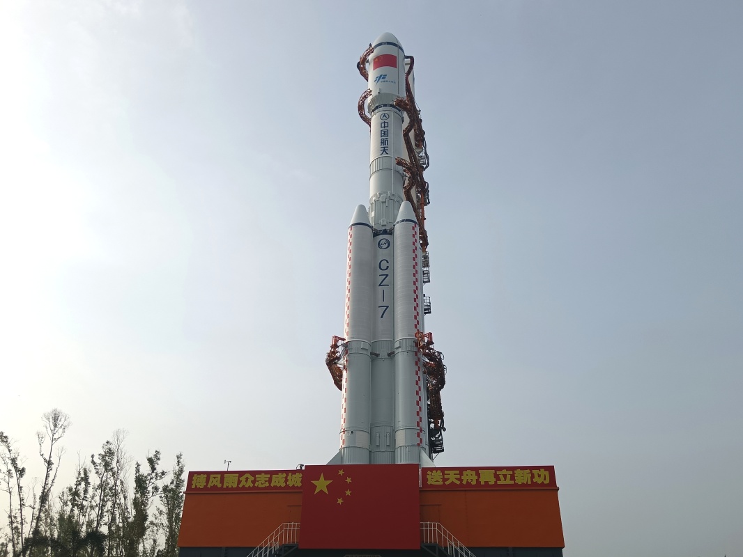 11月13日,天舟八号货运飞船与长征七号遥九运载火箭组合体垂直转运至发射区。