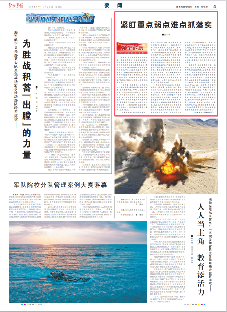 “凡事有其要,执其要者事成。”部队工作千头万绪,分不清主次、辨不明轻重、眉毛胡子一把抓是不行的,必须明晰重点、找准落点。重点,是“牵一发而动全身”的关键点,是“落一子而全盘活”的紧要点。抓落实抓住了重点,才能纲举目张、事半功倍,把工作抓出实效、落到实处。重点找准后,坚持站上高位抓落实、科学统筹抓落实、示范引领抓落实、创新驱动抓落实、严格督导抓落实,重点工作方能真正成为全面工作的引领。在突出重点抓落实的同时,还应学会“弹钢琴”,关注和兼顾其他工作,防止单打独斗、顾此失彼。因为,重点工作与其他工作是紧密联系、相互影响的。如果只抓重点,忽视其他,工作也是抓不好的。