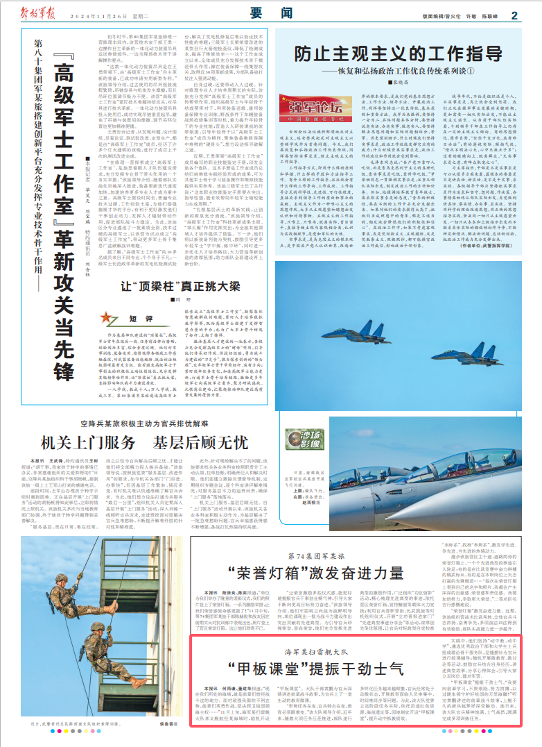 “形势任务在变,官兵特点在变,教育必须跟着变。”该大队领导介绍,近年来,随着大项任务压茬推进,部队遂行多样化任务越来越频繁,官兵经常处于动散状态,开展教育面临人员难集中、时间难同步等问题。为此,该大队党委立足阶段任务实际,依托沿途红色资源、海战遗址等,因地制宜开设“甲板课堂”,提升动中抓教质效。