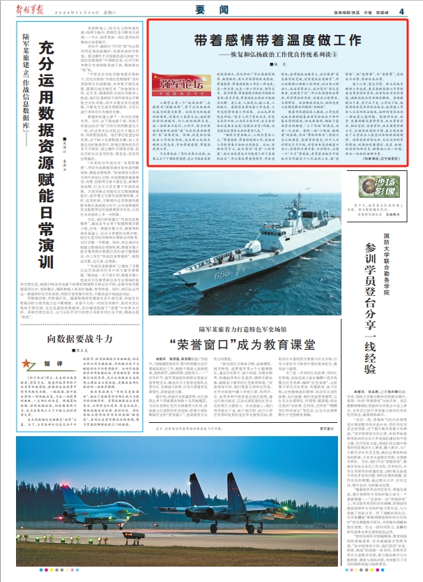 习主席指出:“军队是要打仗的,如果上上下下都没有感情,怎么可能在需要时赴汤蹈火、同生共死?”军队要赢得战争、赢得胜利,离不开深厚的战友情谊。带着感情、带着温度做工作是一种态度,是一种力量,也是一种工作方法、领导艺术。很多难事,带着感情去做就可能轻而易举;很多矛盾,带着温度去做就可能迎刃而解。爱人者,人恒爱之;敬人者,人恒敬之。感情深浅影响着工作态度,工作态度影响着工作效果。正如毛泽东同志所说:“很多人对于官兵关系、军民关系弄不好,以为是方法不对,我总告诉他们是根本态度(或根本宗旨)问题,这态度就是尊重士兵和尊重人民。”