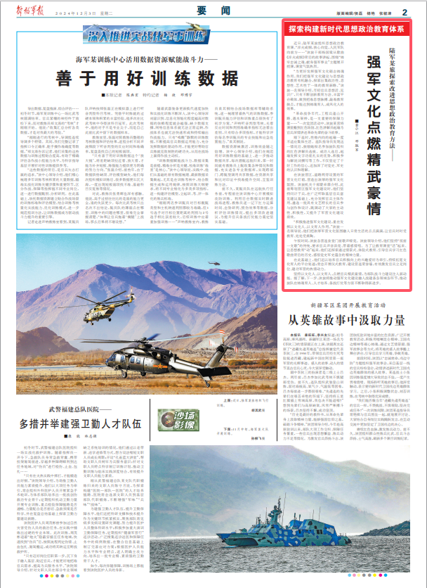 坚持以文化人、以文育人,点燃官兵精武豪情,为部队战斗力建设注入新动能。据了解,下一步,该旅将推动强军文化建设融入战建备各领域各环节,推动旅队在铸魂育人、人才培养、备战打仗等方面不断取得新进步。