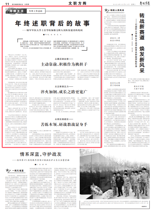 “暂别教研室,到大队担任教学副队长已有半年。其间,我与学兵同吃同住、共同进步,还充分发挥自身优势开展系列文化活动,这段经历十分宝贵。”转改文职人员彭至汉在年终述职报告中写道。