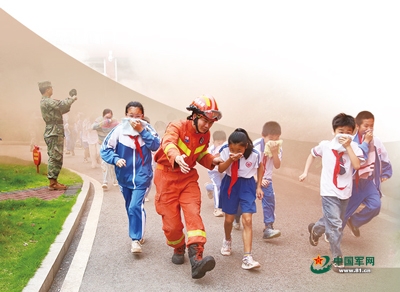 湖南省新田县民兵与县消防救援大队、学校师生进行防灾减灾训练。徐红 摄