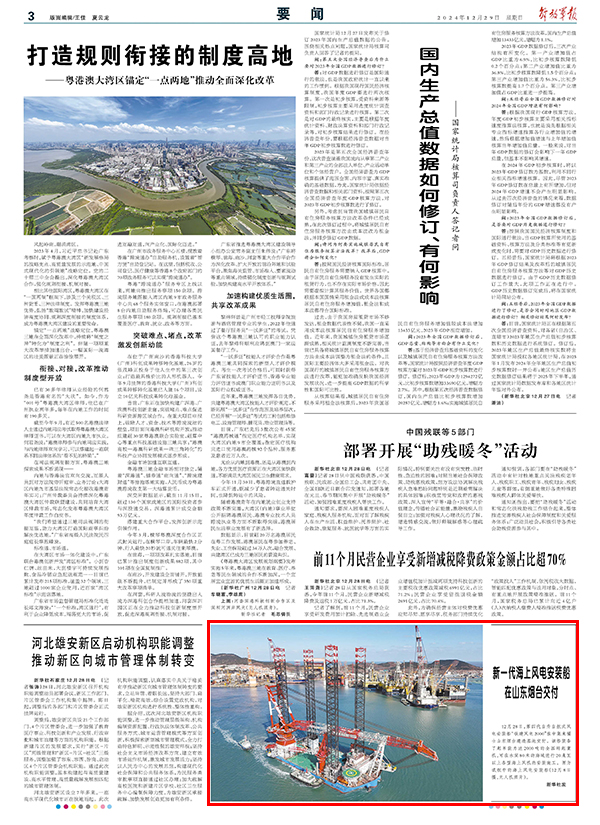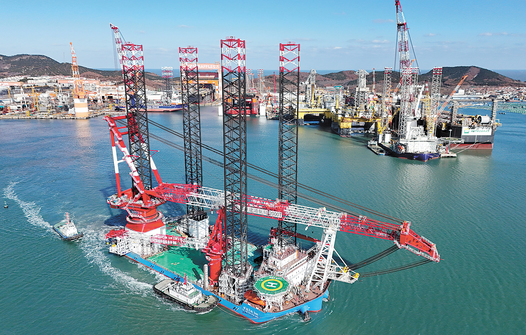 12月28日,第四代自升自航式风电安装船“铁建风电2000”在中集来福士山东烟台建造基地交付。该船装备了起吊能力达2000吨的全回转起重机,可在水深80米的海域进行20兆瓦以上各型海上风机的安装施工。图为试航中的海上风电安装船(12月8日摄,无人机照片)。新华社发