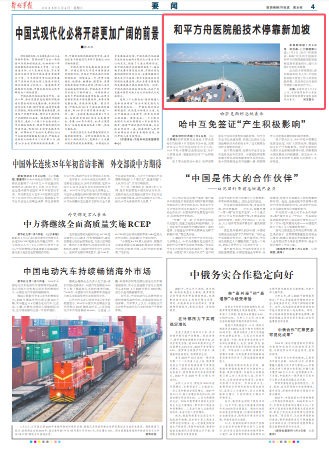 解放军报新加坡1月3日电 刘志磊、记者杨晓霖报道:1月3日,执行“和谐使命-2024”任务的中国海军和平方舟医院船抵靠新加坡樟宜海军基地码头,进行为期5天的技术停靠。