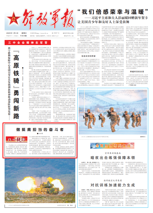 习主席在二〇二五年新年贺词中指出,“无数劳动者、建设者、创业者,都在为梦想拼搏”,光荣“属于每一个挺膺担当的奋斗者”。这一重要讲话,鼓舞人心、催人奋进。新的一年,广大官兵要勇于拼搏、不懈奋斗,做挺膺担当的奋斗者,为新时代强军事业贡献智慧和力量。