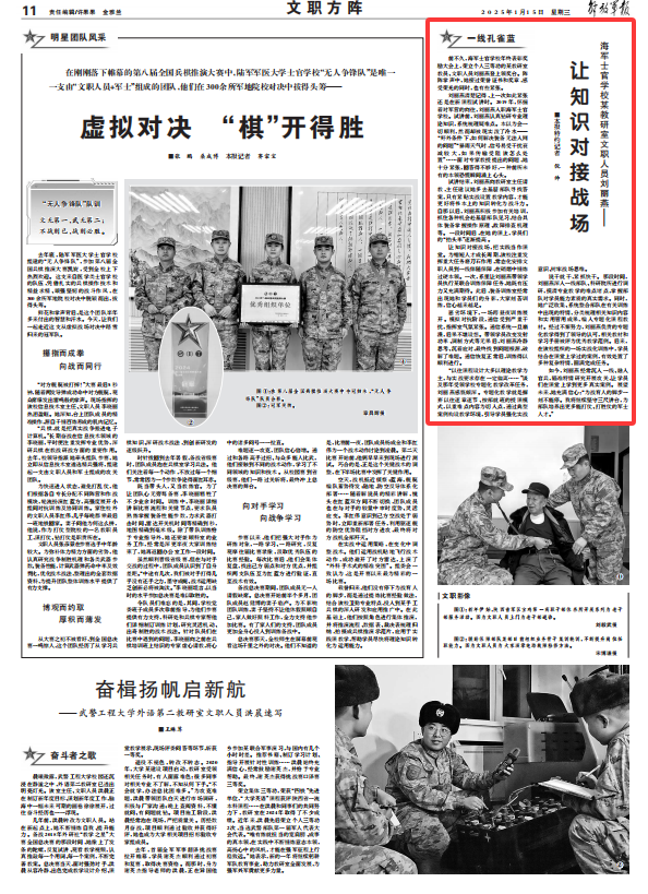 如今,刘丽燕经常沉入一线、融入官兵,瞄准特情研究开展攻关,让学员们在课堂上学到更多真实案例。展望未来,她充满信心:“为战育人的脚步一刻不能停。我将继续坚守三尺讲台,为部队培养出更多能打仗、打胜仗的军士人才。”