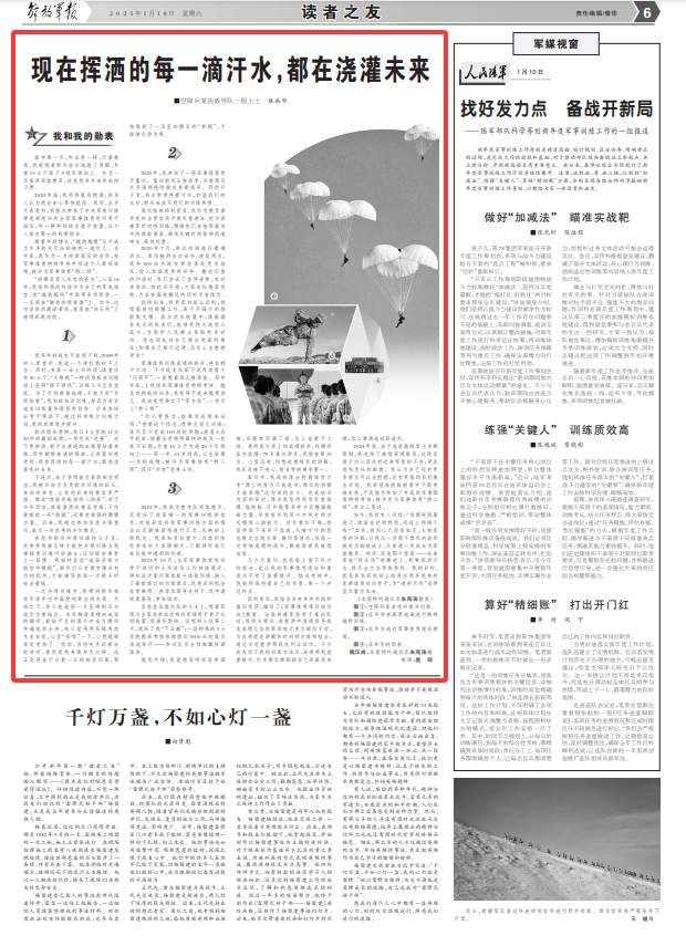 如今,依然有人问我:“你都延期服役了,体能也达到特级,还这么拼图个啥?”其实,我内心已经很知足,火热军营的淬炼,让我从一名弱不禁风的新兵蜕变为钢铁战士,从普通一兵成长为军体教员。然而,还是那个答案——站在军旅“延长线”的赛道上,更要挥洒汗水、拼尽全力去争取胜利。我的目标,就是在本职岗位上培养出更多优秀的军事体育组训骨干,为“迷彩天兵”逐梦蓝天蓄力加油。