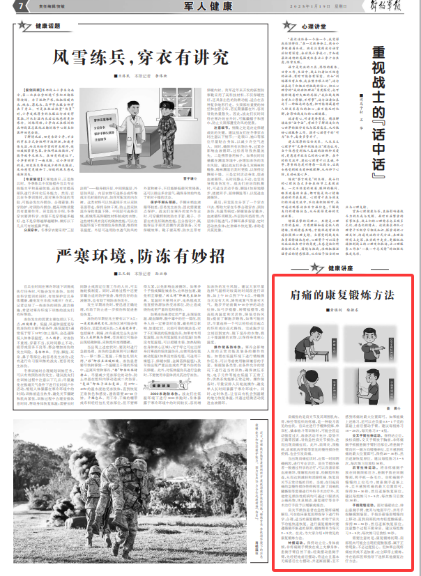 肩痛指的是肩关节及其周围肌肉、骨、神经等组织的疼痛,是一种较为常见的症状。官兵在进行手榴弹投掷、单双杠、擒拿格斗等训练时,可能会因运动强度过大、准备活动不充分、姿势不正确等因素,导致急性肩关节损伤,进而出现肩痛症状。此外,肩周炎、颈椎病、肩部肌肉劳损等常见的慢性损伤性疾病,也会引发肩痛。