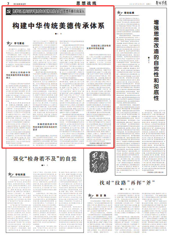 构建中华传统美德传承体系是党的二十届三中全会赋予文化领域的重要使命。弘扬中华传统美德是一个长期的历史任务,必须发挥历史主动精神,绵绵用力、久久为功,让中华传统美德在新征程上焕发出更加绚丽的光彩。