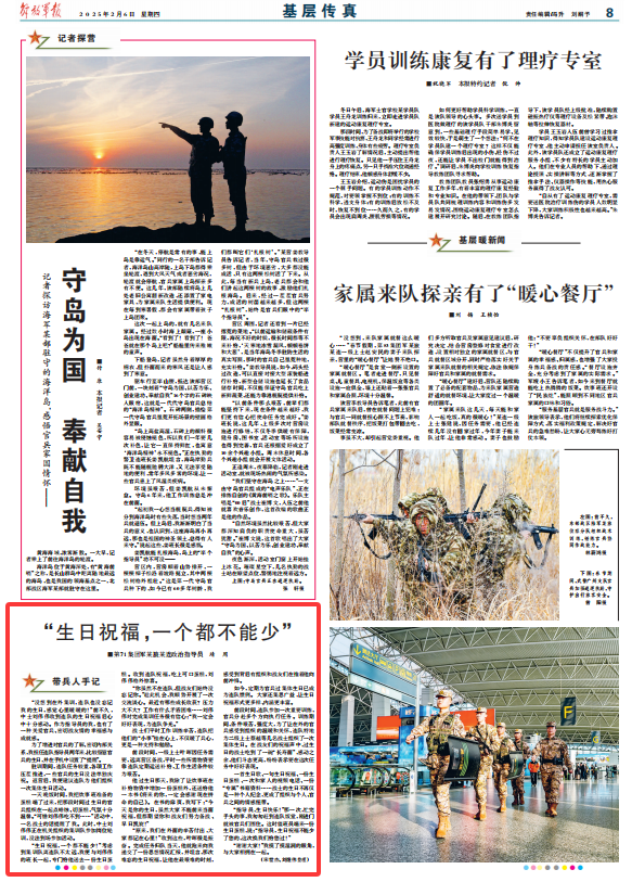 一首生日歌、一句生日祝福、一份生日蛋糕、一次和家人的视频电话、一份“专属”书籍资料……战士的生日不再仅是一种个人纪念,更成了组织与个人、官兵之间的情感纽带。