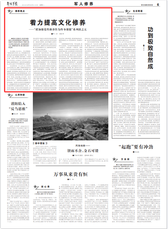 在精研深思中淬炼。“学而善思,然后可与适道。”文化修养是根植内心的一种修为、一种品质、一种情怀。钻研思考是一个对所学知识进行消化、吸收和转化的过程,也是提高文化修养的有效方法。粟裕善于从整体和系统的角度分析战场态势,因敌而变,做出精妙的作战计划,并且时刻为胜利而思考,终身在研究战争。通过钻研思考知其意、明其理、悟其道,提高的不仅是能力、本领,也是文化修养水平。面对科技之变、战争之变、对手之变,军队党员干部要提高文化修养,必须坚持用习近平强军思想凝心铸魂,深入贯彻习近平文化思想,深刻领悟习主席就新时代文化建设提出的一系列新思想、新观点、新论断,深刻感悟贯穿的深厚文化情怀、坚定文化自信、高度文化自觉、强烈文化担当,不断增强文化修养的思想引领。要研史析理,探究和领悟中华优秀传统文化的思想精华和当代价值,中华传统兵学的治军智慧和胜战谋略,以及实现创造性转化和创新性发展的方法和路径,厚积文化修养的历史底蕴。要研战谋战,深入钻研战争理论和作战理论,探究现代战争制胜机理和作战方式的新变化、遏制战争和打赢战争的新方略,充实文化修养的军事意蕴。
