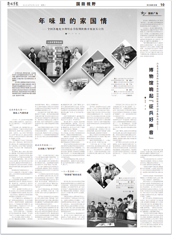 在年货大集现场开设征兵宣传点,邀请书法家书写国防主题春联,在春节档电影开场前播放征兵宣传片……各级征兵办充分利用春节假期,结合年俗传统和文旅活动开展征兵宣传和国防教育活动,营造出欢度佳节不忘国防义务的浓厚氛围,在浓浓年味中融入国防元素、发出从军召唤。