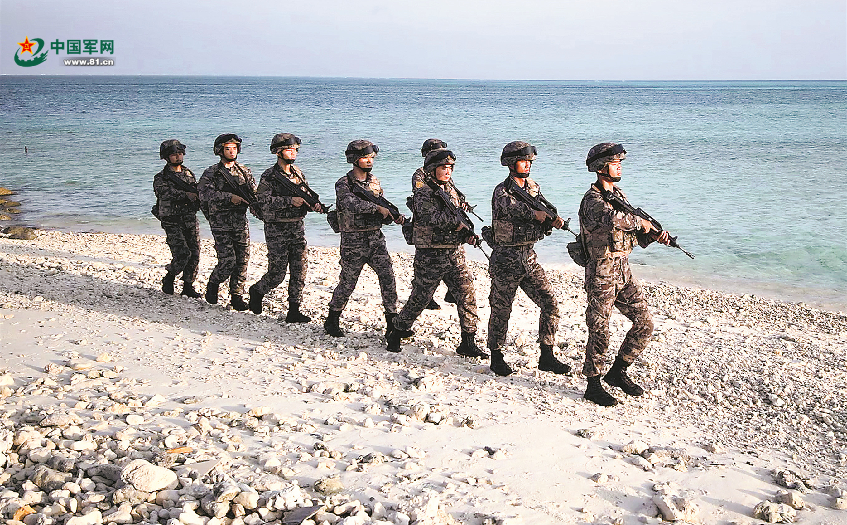 南海守礁官兵在岛礁上巡逻。