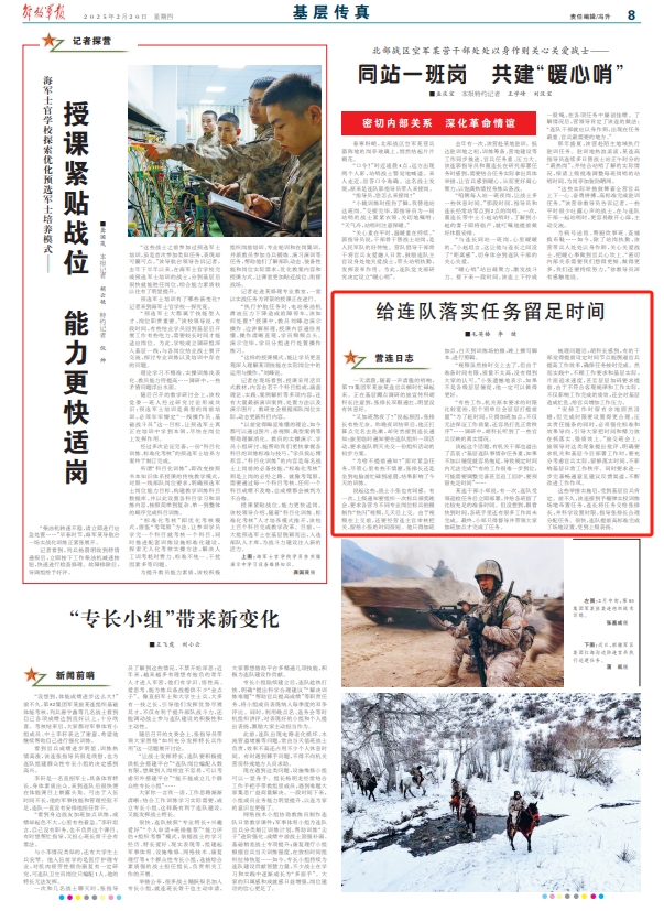 这些举措实施后,受到基层官兵肯定。前不久,该连接到手榴弹实投训练场地布置任务,连长将任务交给张排长,并科学设置时限,指导张排长合理分配任务。很快,连队提前高标准完成了场地设置,受到上级表扬。