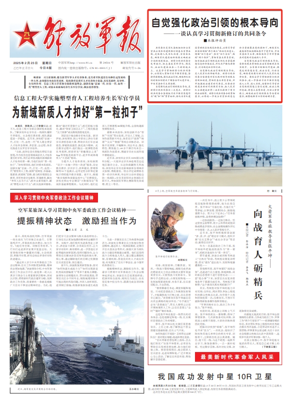 自觉强化政治引领的根本导向,是新修订的共同条令一大亮点。新修订的共同条令坚持把习近平强军思想作为“魂”和“纲”贯穿始终,转化为军队建设管理的具体规范和要求,必将引导官兵深刻领悟“两个确立”的决定性意义,增强“四个意识”、坚定“四个自信”、做到“两个维护”,贯彻军委主席负责制,切实把政治引领的成效内化为崇高理想信念和价值追求,外化为严格纪律要求、行为规范和实际行动。