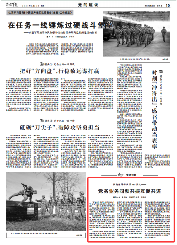 管党务党举措落实落地,支部战斗力水涨船高。着眼使命任务,该院在党建工作中不断强化向战而行、为兵服务的宗旨意识,先后多次完成重大医疗保障、下部队巡诊送医等任务。今年初,医院野战医疗队全员全装机动至陌生地域,与保障部队展开一线协同,深入研练手术力量前移、批量伤员快速分类等课目。全体队员在临时党组织的坚强领导下,斗志昂扬、精诚团结,高标准完成野外驻训和检验性拉动任务,有效锤炼了战斗力和保障力。