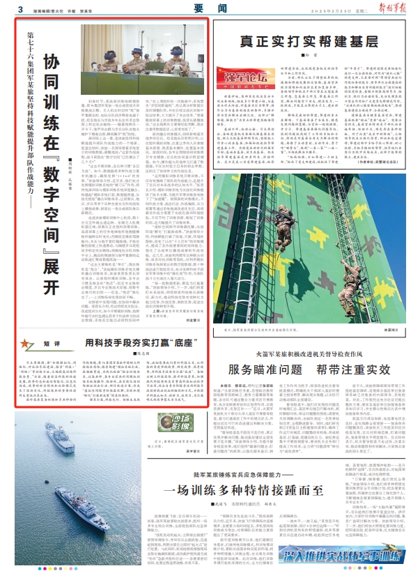 面对高原复杂环境和多兵种协同作战难题,第76集团军某旅牢固树立科技练兵思维,探索构建“模拟系统打底、数据链贯通、实战化检验”融合训练体系,让各兵种、各专业官兵利用模拟训练系统练操作、练协同,在实战化演训场验证训法打法、研讨改进方案,形成“虚拟空间探寻训练最优解,实战环境‘孵化’打赢新成果”的良性循环。