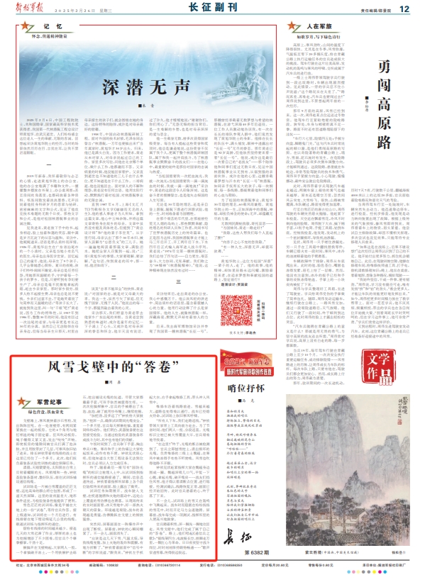 官兵踏着积雪,深一脚浅一脚地往回走。风雪戈壁中,他们完成了属于自己的“答卷”。路上,他们唱起《通信兵之歌》:“银线架四方,电波振长空,铁脚走万里,一颗红心为革命。日日夜夜坚守战斗岗位,时时刻刻保持联络畅通……”歌声穿透雪幕,传得很远很远。