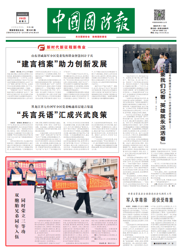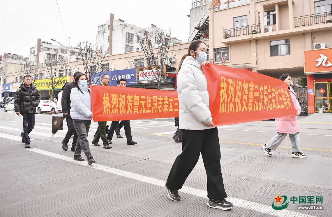 “老曹家的双胞胎儿子,同时立功啦!”2月12日,安徽省当涂县姑孰镇行陈社区锣鼓喧天,县军地相关人员组成的送喜报小分队,将两份三等功喜报送到现役军人双胞胎兄弟曹元庆、曹元生家中。兄弟俩同年入伍、同时立功的消息,在当地传为佳话。