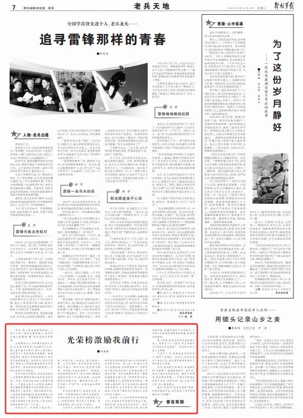 在刘班长影响下,我刻苦训练,当兵第一年军事考核3个课目全部优秀。刘班长退役不久,在年终总结表彰大会上,我获得嘉奖,照片登上光荣榜。排名虽然靠后,我心里也十分高兴。