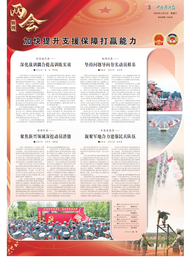 “国防动员系统担负支援保障诸军兵种联合作战任务,是面向三军、保障打赢的坚强后盾。各级应紧贴使命任务,坚持问题导向,完善机制、创新方法、向战聚焦,夯实推动国防动员高质量发展的根基。”全国人大代表、河南省军区司令员赵钧说。