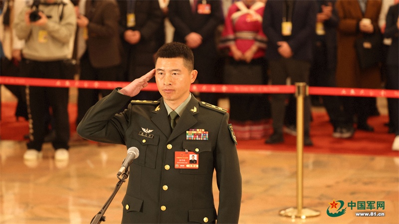 全国人大代表、陆军第82集团军某旅张冬旭在“代表通道”回答记者提问。中国军网记者 李庆桐摄